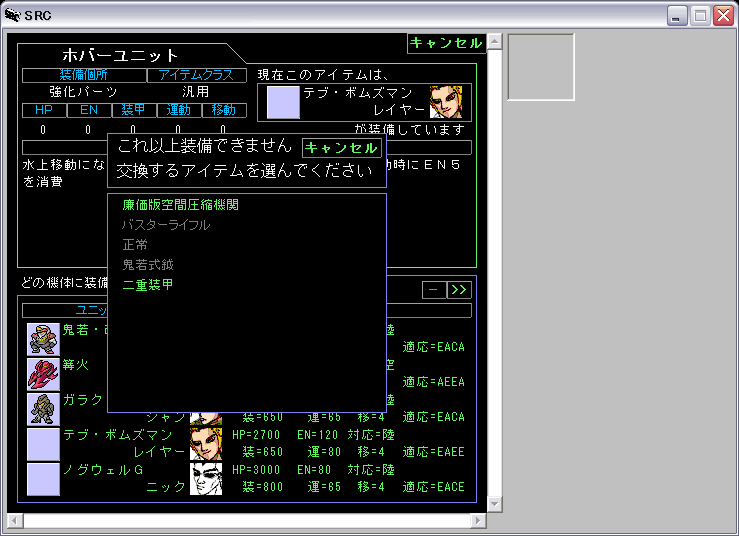 と言うことで、アイテム詳細情報画面とユニット選択画面を一緒にしました。 いや、動作を確認しているときに、 何度も「OK」をクリックしなくてはいけなくて、面倒だったので…。 [独自アイテム交換インクルード v060612] ・アイテム詳細情報画面とユニット選択画面の合体 ・ユニット選択画面で、ユニット名やパイロット名が長い場合の対応 しかし、これによって必要不可欠になってしまった処理が2つ。 ・武器&アビリティが合わせて3以上のときのためのスクロール処理 ・6体以上ユニット数があるときのためのページ処理 一応、ページボタンの配置はしてありますが、あれはダミーです。 なんせ、アイテムリストページの処理そのまんま移動しただけなんで。 更に、遣り残した処理が、 ・アイテム一覧画面のユニット名・装備数ソート処理 ・同画面で、ユニットをクリックした際に参照できるように ユニット能力&装備アイテム画面を表示すること ギャー。やることいっぱい。 さて、明日は何を作ろうか……。 さて、お仕事の始まる月曜日、みなさんは如何お過ごしでしょうか?