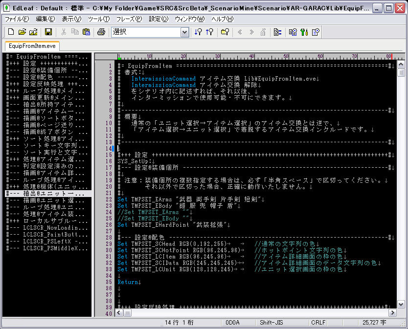 本日は、私の使用しているツールを紹介したいと思います。 [テキストエディタ:EdLeaf v1.02] 色々無料のテキストエディタをDLしましたが、これに落ち着きました。 このエディタの一番のメリット、そして私が一番求めていた機能、 それはSSを見ていただければ分かると思いますが、 「指定文字列による見出し機能」! それです。 何が便利って、いちいちスクロールして探さなくても、 書いてある場所を一発で見つけられる、という点です。 それまでは、散々、スクロールして、 「ここでもない。そこでもない」と探し回っていましたし、 時には「どこに書いたか忘れてしまった」なんてこともあって、 こういう機能があれば楽なのに、と探すに探して、 ようやく見つけ出したものです。 その他にも、 ・背景や文字の色を指定できる ・コメントタグの色を指定できる ・登録した文字列の色を変えられる ・タブ機能があって、同時編集が楽 など、色々と利点があります。 ただ難を言えば、このエディタ、 もうバージョンアップがされない、ほったらかしのツールなんですよね。 でも、SRCシナリオ製作には充分なテキストエディタだと思います。 是非とも、オススメしたい一品。 配色や文字列の登録など、最初の設定はちょっと大変ですけど……。 使ってみたいという方はこちら→ http://www.vector.co.jp/soft/win95/writing/se258143.html え? それよりもインクルードの製作をしろ? わーてますよ。これから、やる所ですよ。そんなに急かさなくても……。 |