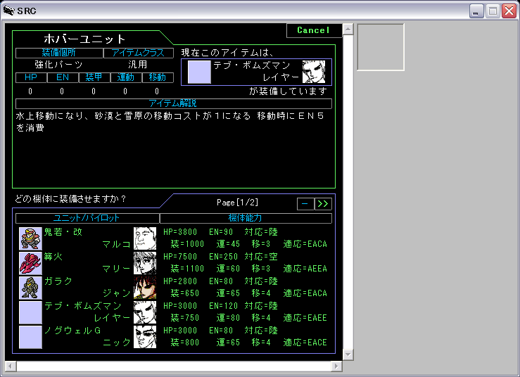 と言うことで、アイテム詳細情報画面とユニット選択画面を一緒にしました。 いや、動作を確認しているときに、 何度も「OK」をクリックしなくてはいけなくて、面倒だったので…。 [独自アイテム交換インクルード v060612] ・アイテム詳細情報画面とユニット選択画面の合体 ・ユニット選択画面で、ユニット名やパイロット名が長い場合の対応 しかし、これによって必要不可欠になってしまった処理が2つ。 ・武器&アビリティが合わせて3以上のときのためのスクロール処理 ・6体以上ユニット数があるときのためのページ処理 一応、ページボタンの配置はしてありますが、あれはダミーです。 なんせ、アイテムリストページの処理そのまんま移動しただけなんで。 更に、遣り残した処理が、 ・アイテム一覧画面のユニット名・装備数ソート処理 ・同画面で、ユニットをクリックした際に参照できるように ユニット能力&装備アイテム画面を表示すること ギャー。やることいっぱい。 さて、明日は何を作ろうか……。 さて、お仕事の始まる月曜日、みなさんは如何お過ごしでしょうか?